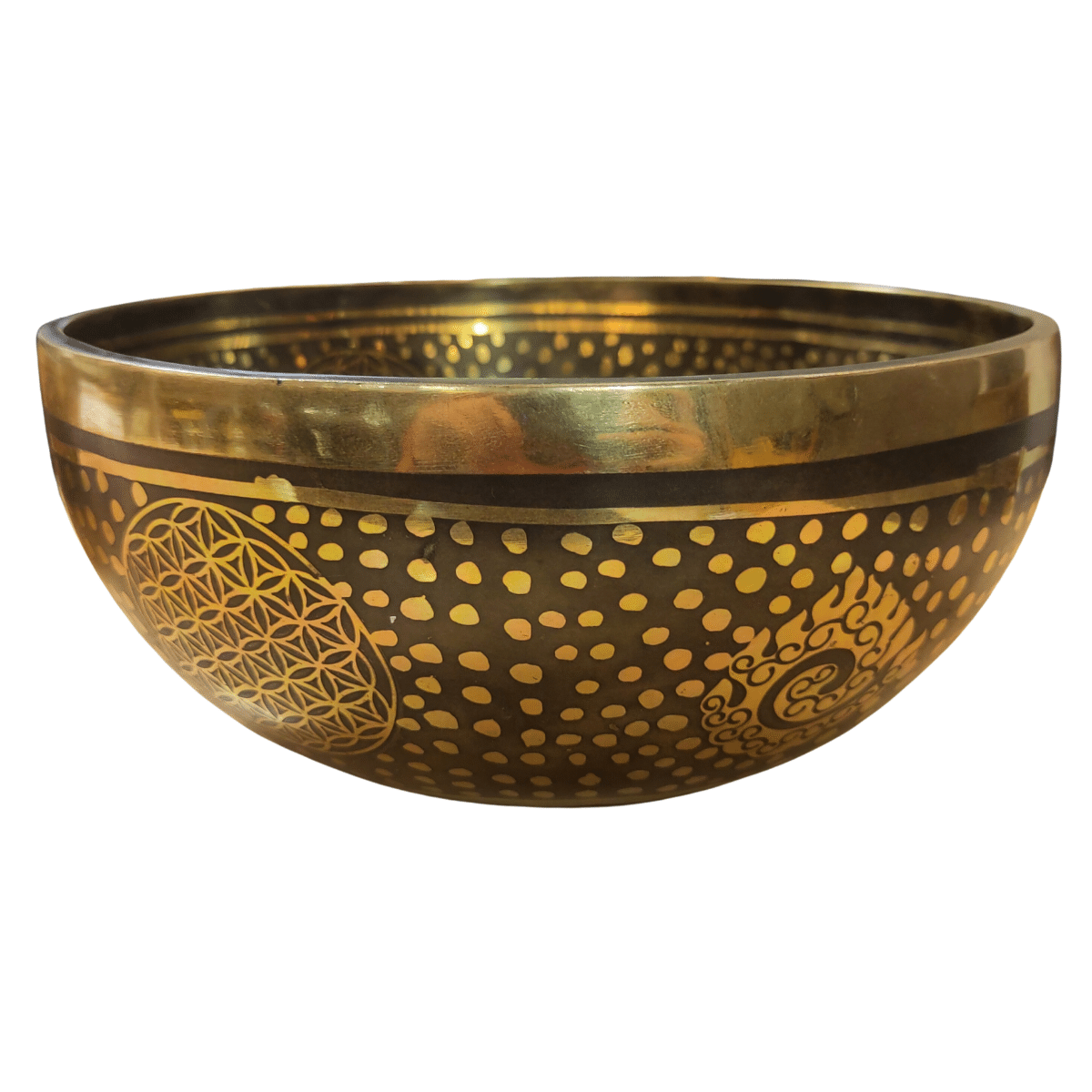 Ces bols présentent la particularité d’avoir une ornementation représentant des symboles religieux sanscrits ou des images de dieux et déesses du panthéon indien ou tibétain. Ces incrustations sont réalisées au Népal et apportent une très belle touche esthétique à ces bols chantants et selon les symboles utilisés peuvent ajouter un ressenti énergétique supplémentaire.