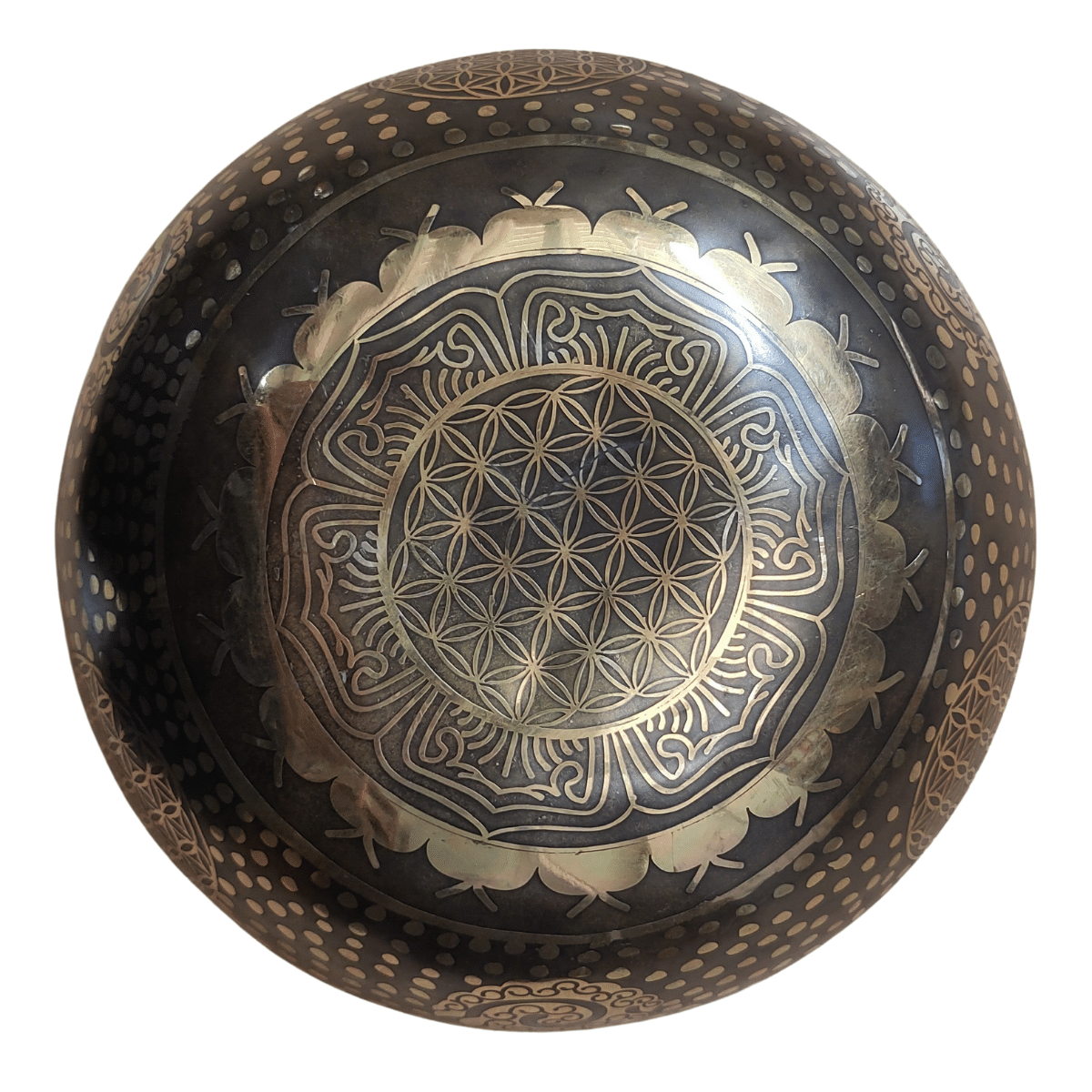 Les bols que nous proposons sont constitués de 7 métaux : or, argent, mercure, cuivre, fer, étain, plomb. Ils viennent de la région du Kérala en Inde, et sont de la famille des bols martelés. Ces derniers sont de nettement meilleure qualité que les bols tournés ou moulés, ils développent un son plus riche en harmoniques.