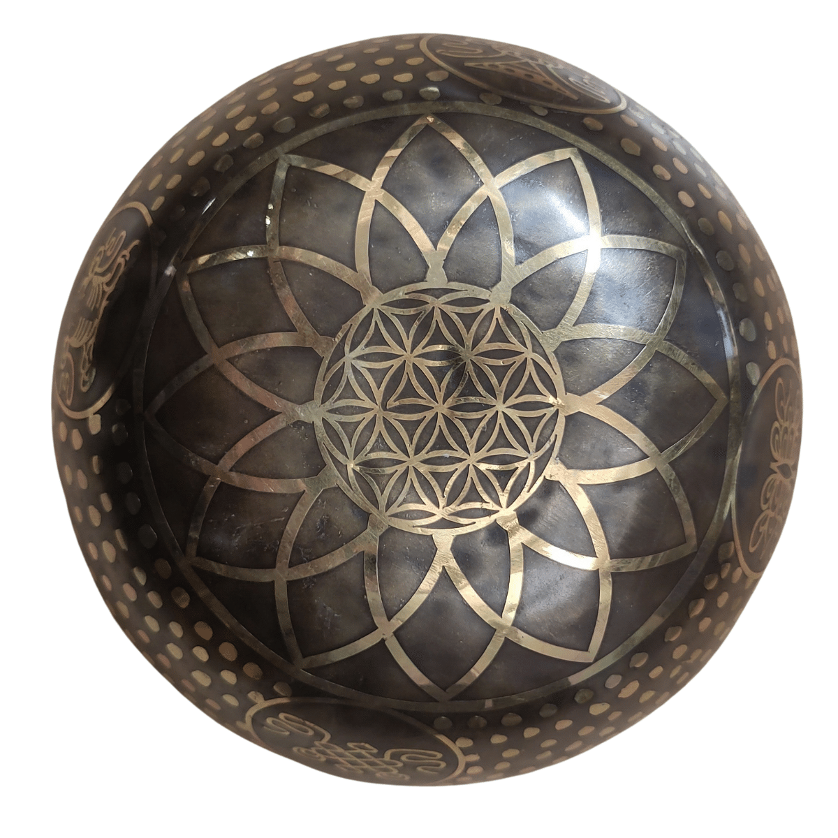Ces bols présentent la particularité d’avoir une ornementation représentant des symboles religieux sanscrits ou des images de dieux et déesses du panthéon indien ou tibétain. Ces incrustations sont réalisées au Népal et apportent une très belle touche esthétique à ces bols chantants et selon les symboles utilisés peuvent ajouter un ressenti énergétique supplémentaire.