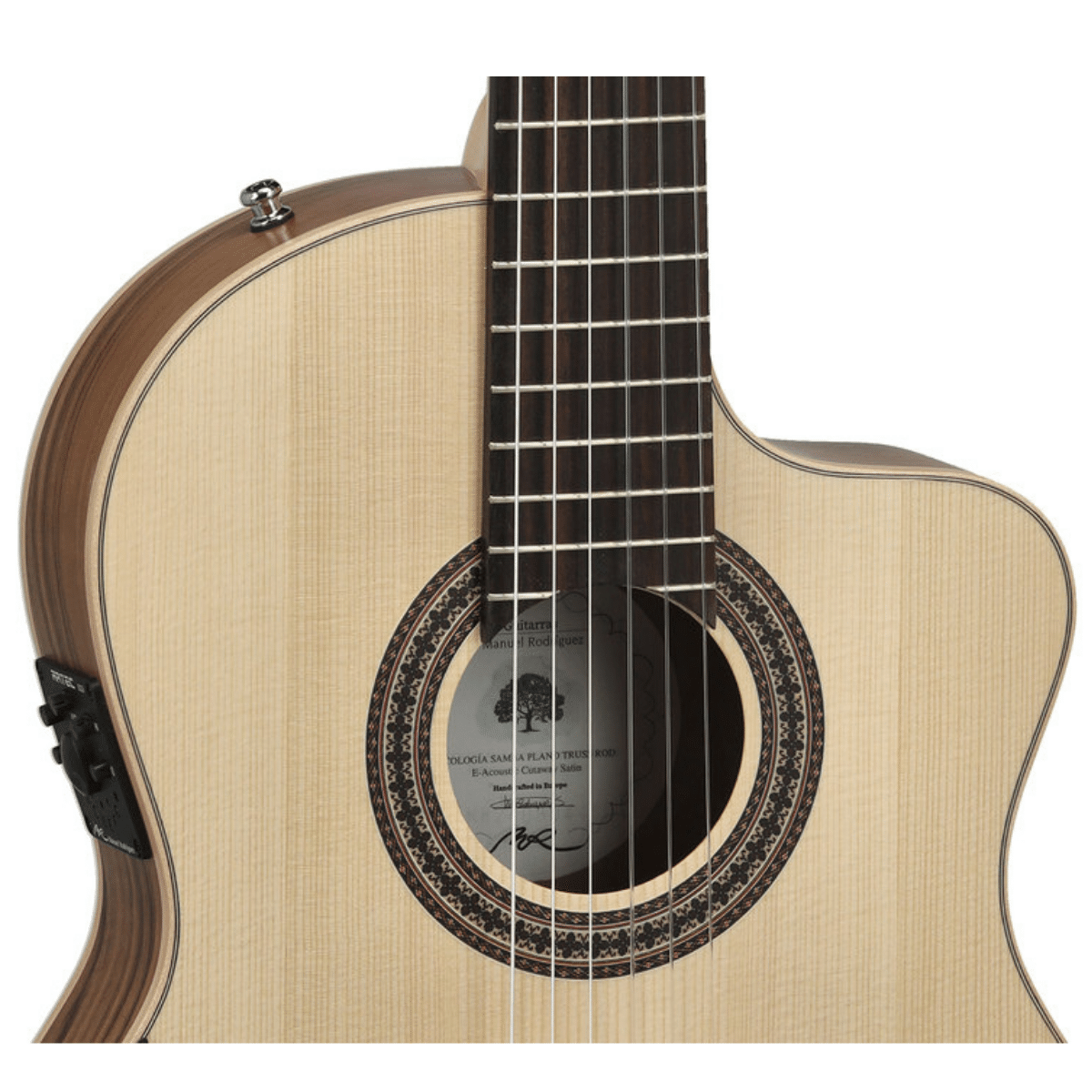 Cette série Ecologia de la gamme Manuel Rodriguez est conçue avec de vraies considérations écologiques; le choix est fait d’avoir recours à des bois uniquement européens, tels que l’épicéa, le noyer, l’érable, l’acacia. Aucun bois exotique n’est employé dans la conception de ces guitares. De plus, la finition est assurée par un vernis écologique mat à base d’eau.