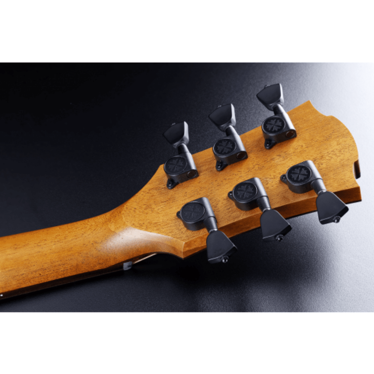 Le Brankowood, bois utilisé pour la touche et le chevalet, a été développé par un scientifique australien dans le but de transormer et d’utiliser des pins issus de forêts à cycle court. Par un procédé dit de tropicalisation, la densité est controlée de manière très précise, et permet de reproduire les qualités acoustiques et physiques d’essences telles que l’ébène ou l’épicéa. Ainsi, nous retrouverons le Black Brankowood en remplacement de l’ébène ou le Pale Brankowood en remplacement de l’épicéa de la table.