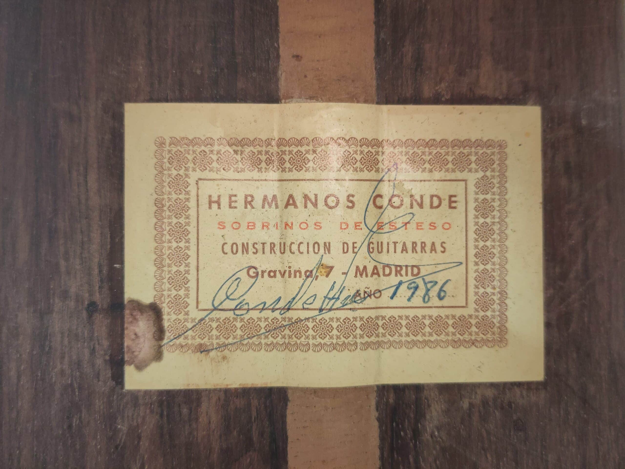 Ces ateliers ont une longue histoire de lutherie; ils ont été fondé en 1915 par Domingo Esteso, grand facteur de guitares espagnoles, lui-même apprenti de Manuel Ramirez, et les ateliers ont perduré grâce à une transmission familiale du savoir-faire. Cette guitare est signée « Hermanos Conde, Sobrinos de Esteso, Gravina, 7 – Madrid, 1986 ».