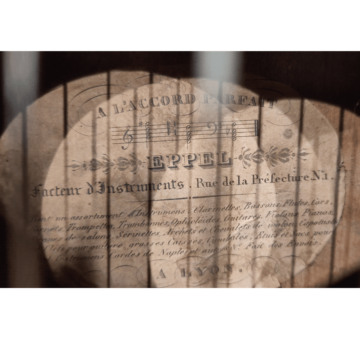 - Très belle étiquette parfaitement lisible: « A l’accord parfait-EPPEL. Facteur d’instruments-Rue de la Préfecture, NI….A Lyon »