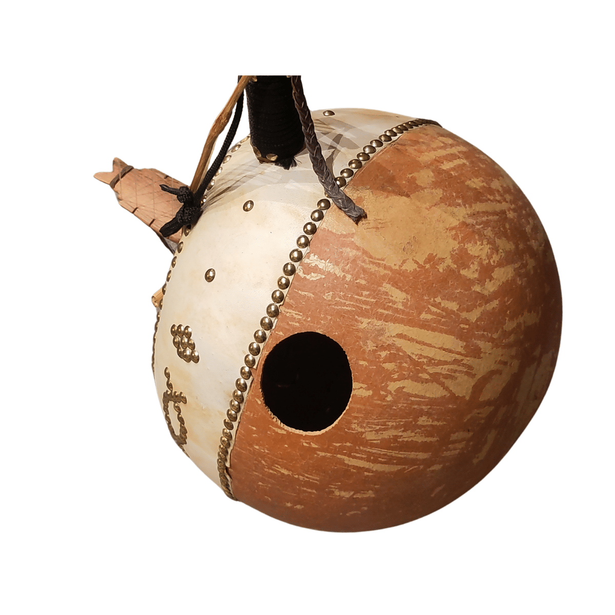 - Corps fait d’une calebasse magnifiquement ornementée avec une peau tendue