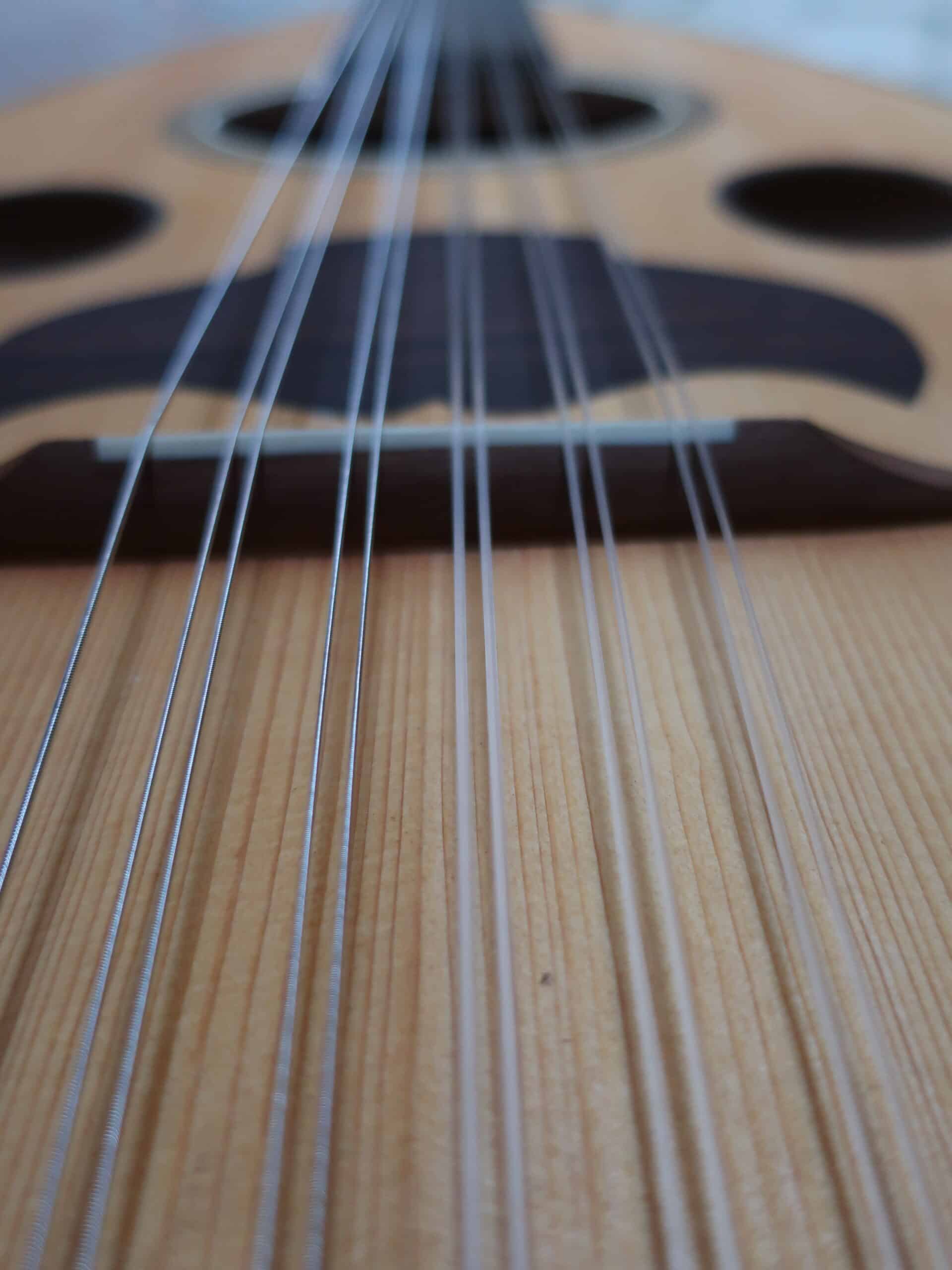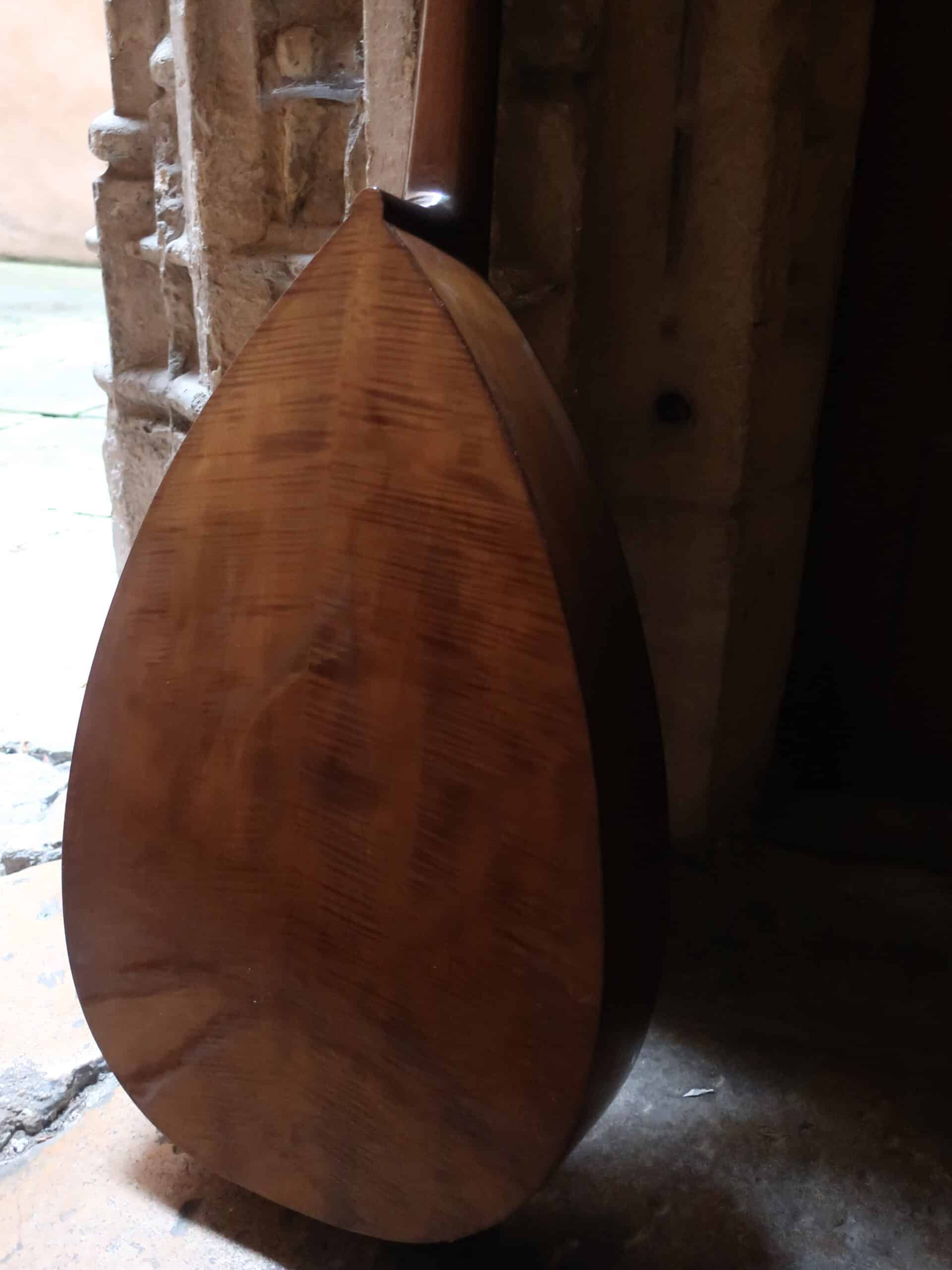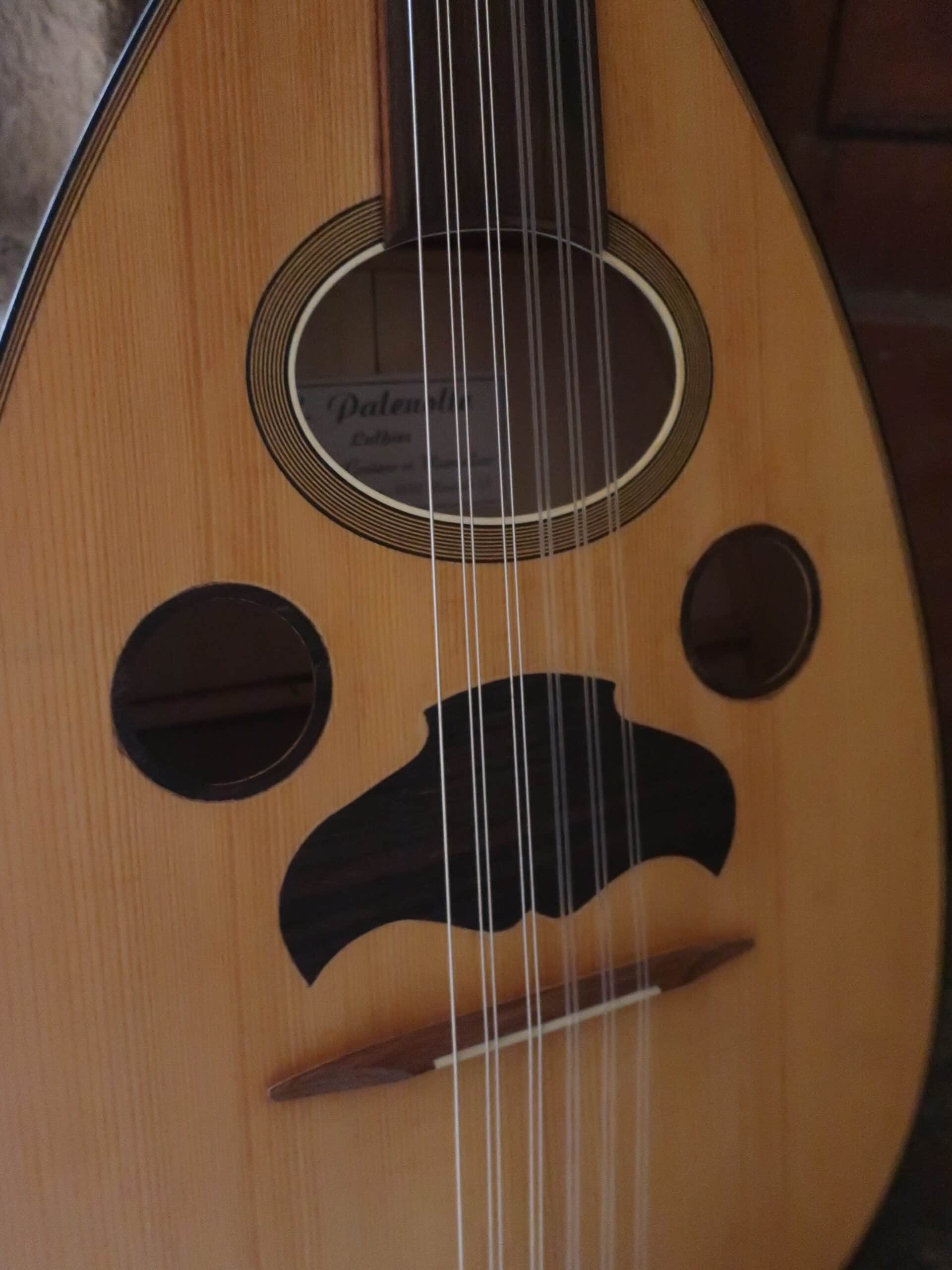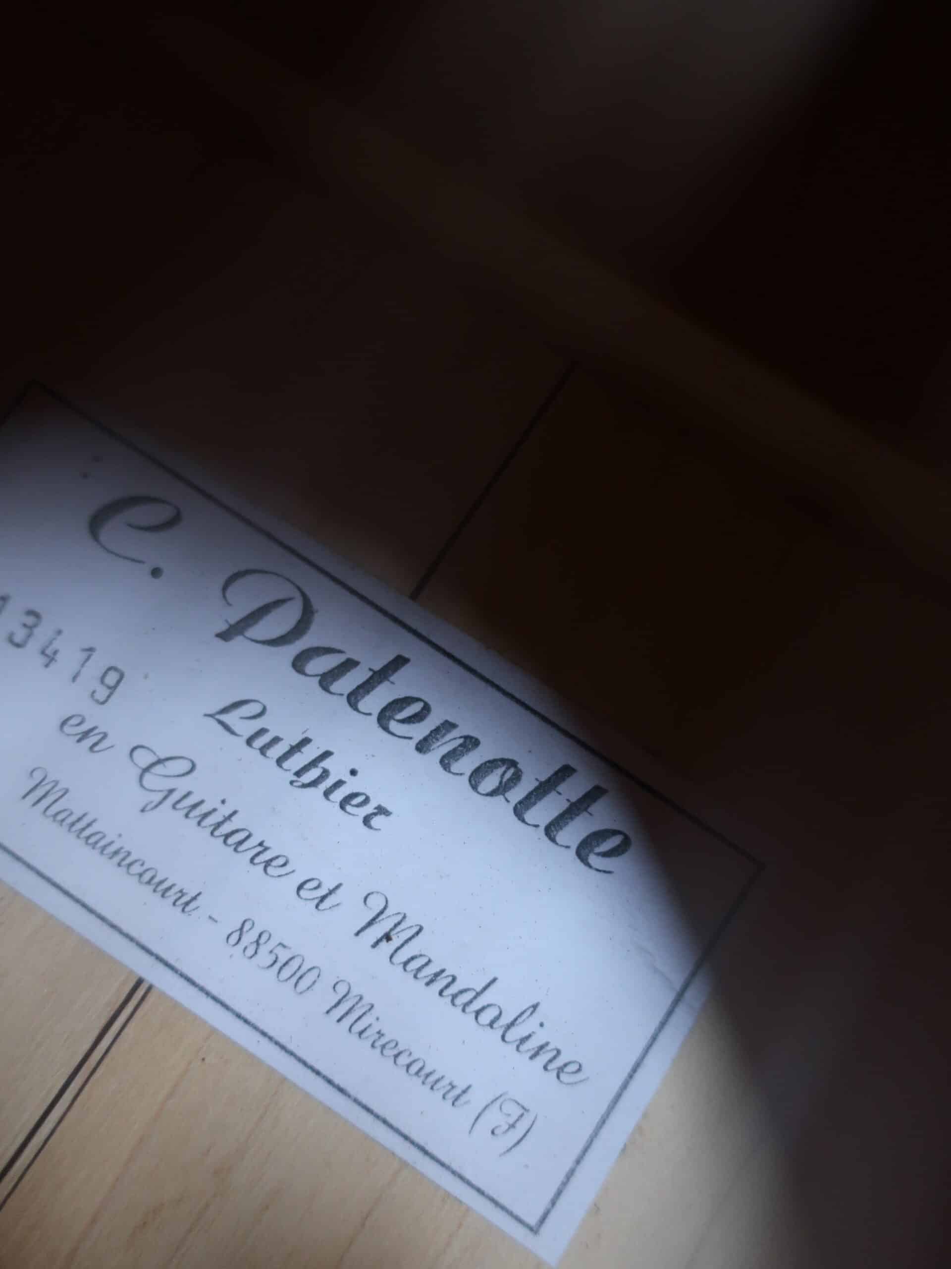 Élégante mandoline française à fond plat, réalisée par le luthier Patenotte, reconnu pour son savoir-faire traditionnel dans la fabrication d’instruments à cordes.