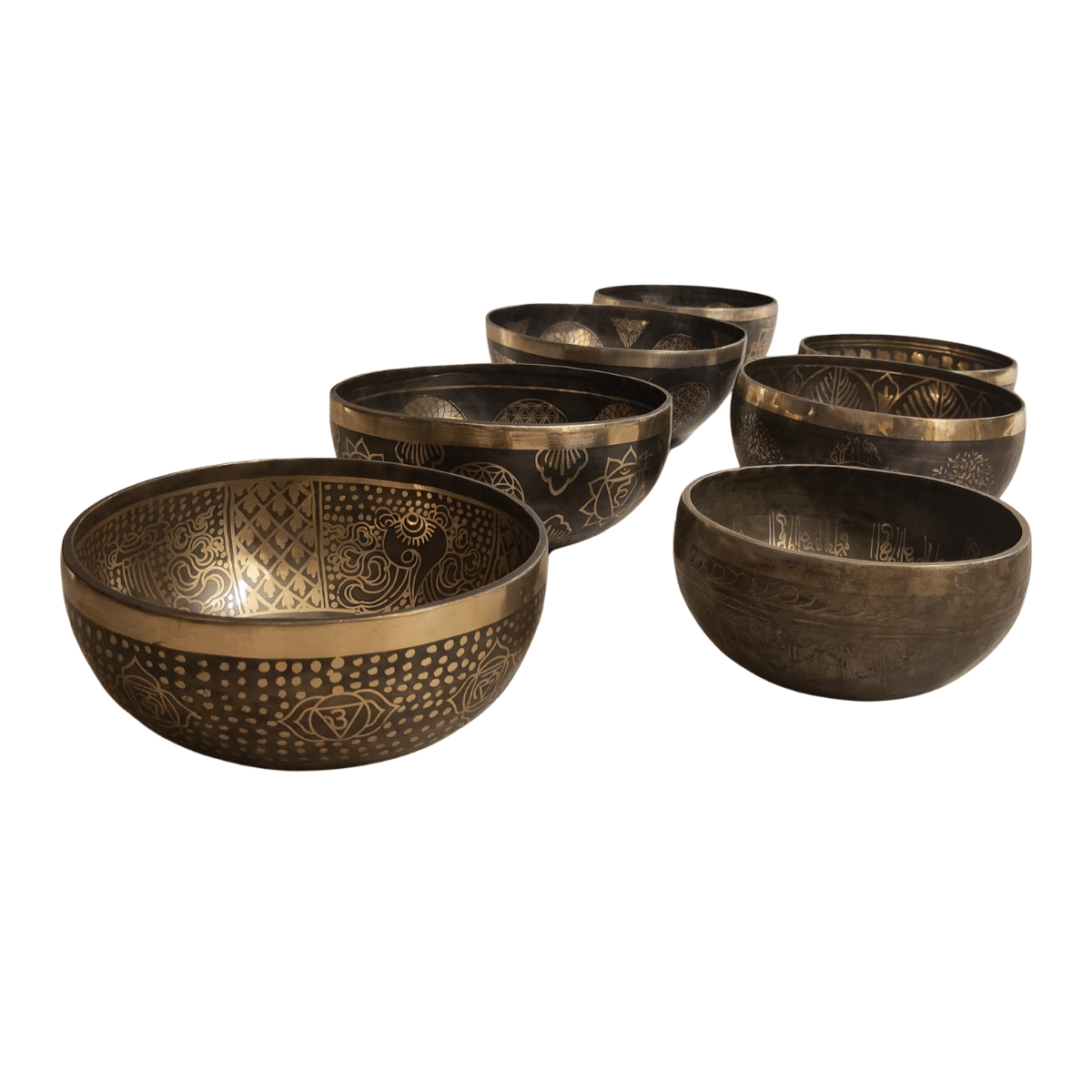 Les bols que nous proposons sont constitués de 7 métaux : or, argent, mercure, cuivre, fer, étain, plomb. Ils viennent de la région du Kérala en Inde, et sont de la famille des bols martelés. Ces derniers sont de nettement meilleure qualité que les bols tournés ou moulés, ils développent un son plus riche en harmoniques.