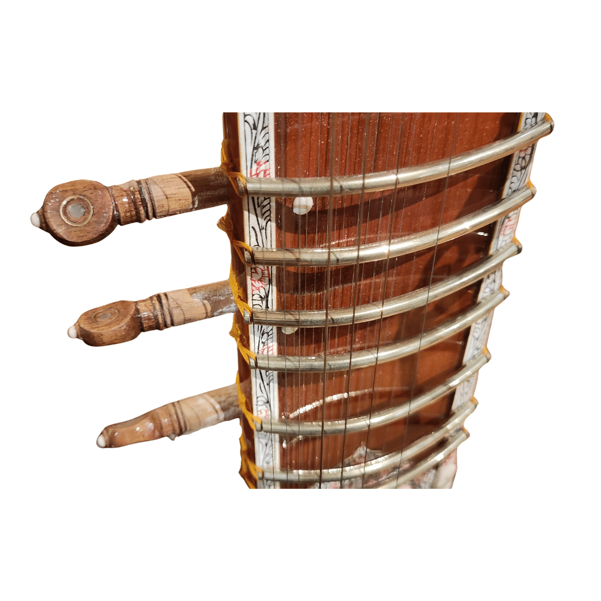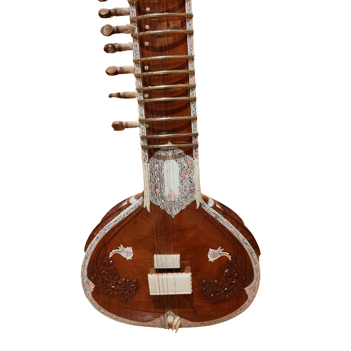 Le sitar est l’un des instruments emblématiques de la musique classique indienne. Il séduit depuis des siècles par son timbre envoûtant, sa richesse harmonique et sa capacité à éveiller l’âme. Composé d’une longue caisse de résonance en bois de teck et d’une calebasse sculptée, le sitar se distingue par ses nombreuses cordes : entre 18 et 21, dont 6 ou 7 jouées et les autres dites « sympathiques », qui vibrent par résonance pour créer un halo sonore unique. De plus, les frettes sont amovibles pour accorder la suite harmonique selon le raga choisi. Le sitar est un instrument qui permet sur une même position de varier la note jusqu’à 2 tons 1/2.