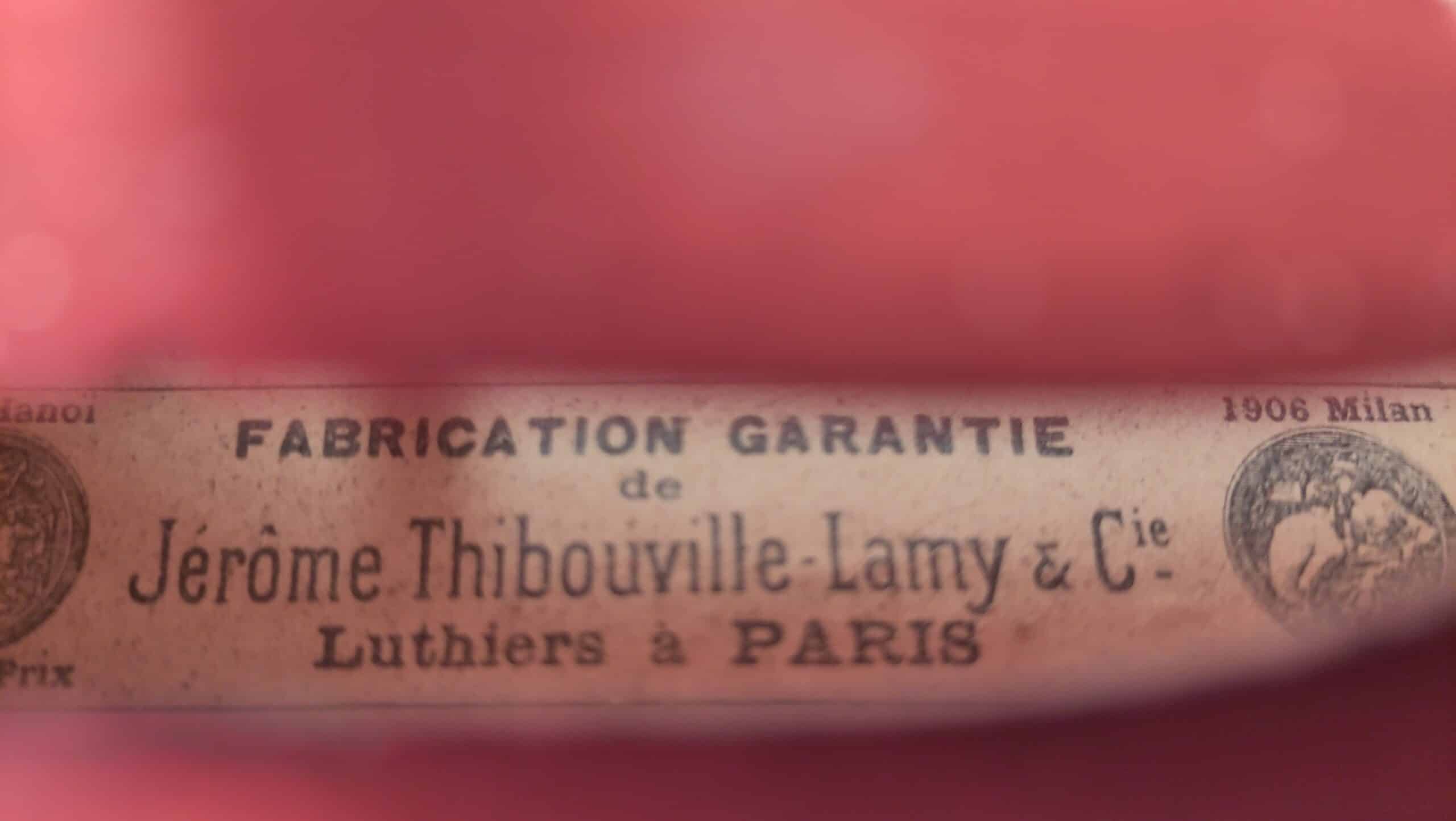 - Porte 2 étiquettes: « Copie de Jiovan Paolo Madini Brescia 1713 » et « Fabrication garantie de Jérome Thibouville Lamy & Cie, Luthiers à Paris ». Visibles dans la galerie d’images
